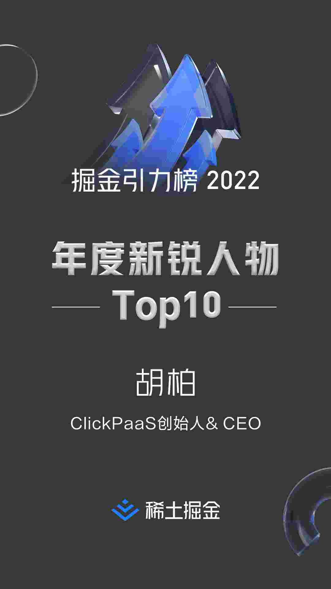 2022年1月6日,,,,,,,,,,,,稀土掘金社区第一届「掘金未来大会」成功举办,,,,,,会上发布了“2022 稀土掘金引力榜 年度新锐人物”榜单,,,,,,,上海爱湃斯科技有限公司(简称华为钱包)创始人及CEO胡柏实力入选年度新锐人物TOP 10。。。。。。